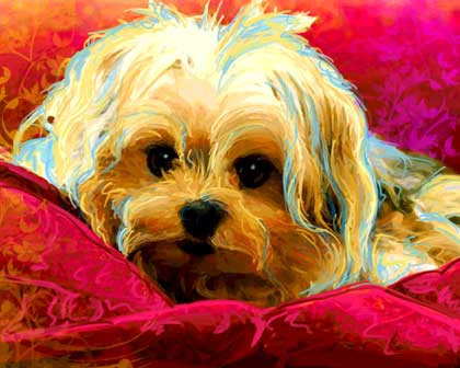 Today I finalized 2 portraits. Flare is a cute little red poodle that I will blog on tomorrow, and Dash is an adorable little Maltese-Poodle mix. Dash's original photo was sort of tough in that Dash's face was very dark and the entire file was only 48k ...which is a pretty tiny resolution. Once I enlarged the image I spent an hour or so dealing with the pixelation that occured. Using the blur tool I went over the pup smoothing out the jagged pixels and creating a very soft blurry image. I then used the Wacom tablet and stylus to paint in the missing detail. Digital paint stroke by digital paint stroke I worked in some fun loose line work and also added some highlights and sparkle to the eyes. I am very pleased with this piece.